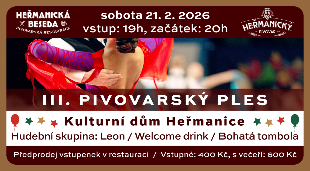 Zveme vás na III. Pivovarský ples, který se uskuteční v sobotu 21. 2. 2026 v Kulturním domě Heřmanice.